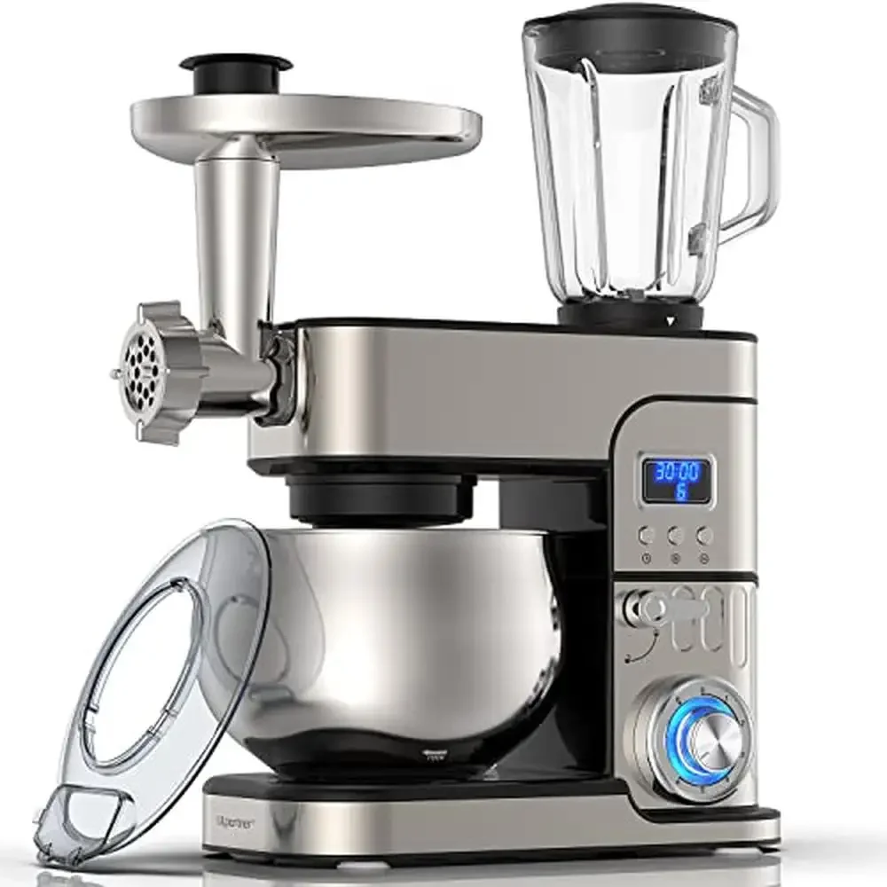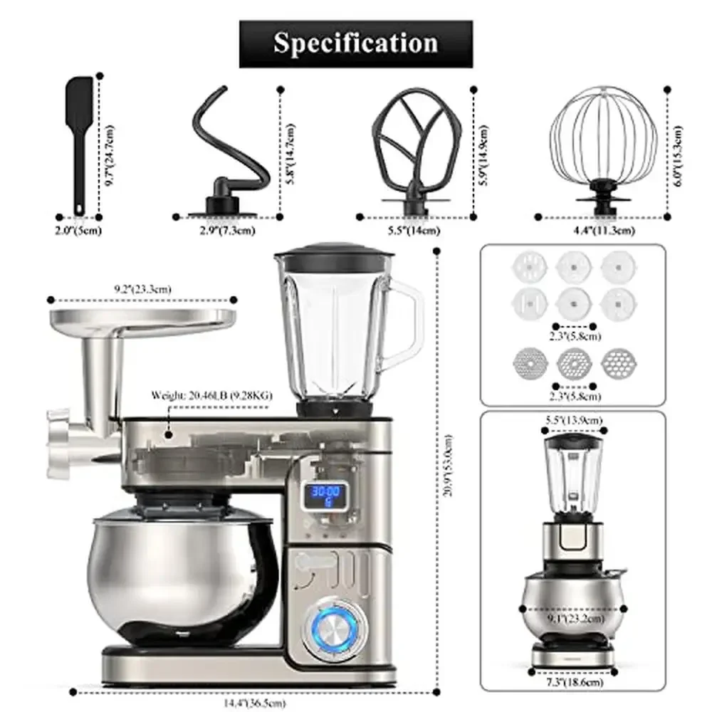 6-in-1 LCD Display Kitchen Electric Mixer 6.5QT Stainless Steel Bowl Multi-Function Mixer Dough Blender Meat Grinder Pasta