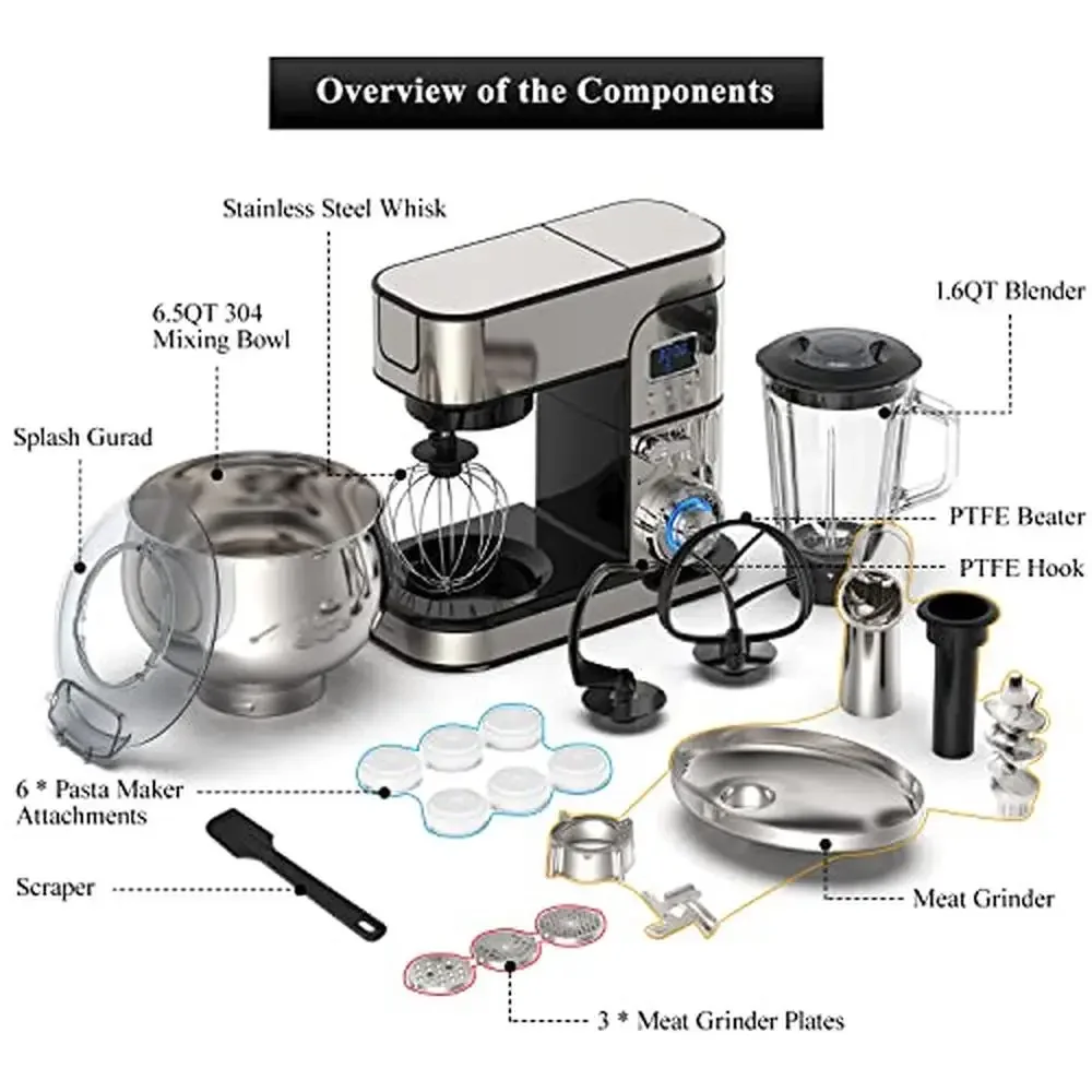 The multifunctional kitchen mixer has a variety of practical functions by adding different ingredients, including pasta machine, meat grinder, blender. 6. 5-QT 304 stainless steel body design, stainless steel whisk, PTFE dough hook, PTFE beater, splash guard and scraper, which can be easily fixed on the shaft, and 360°planetary trajectory mixing makes the mixing more thorough.
