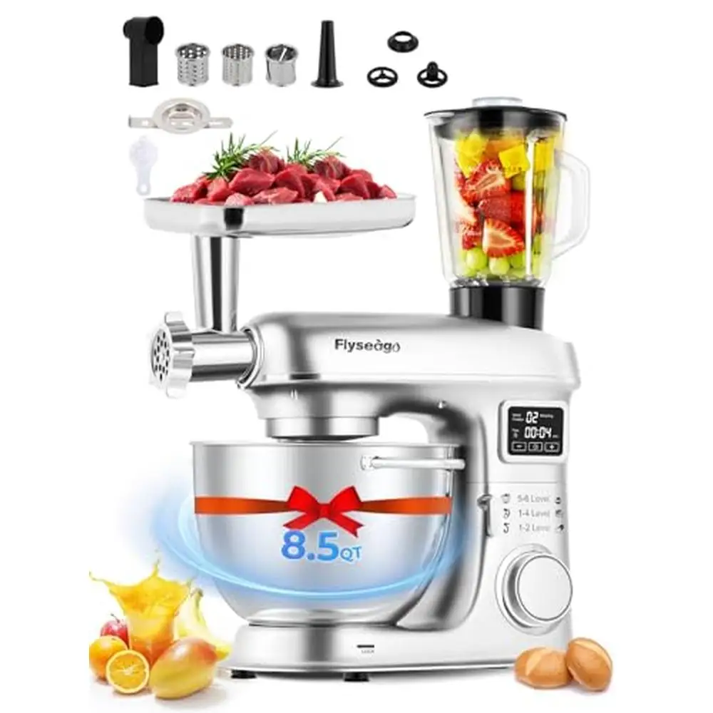 8-IN-1 Multifunctional Stand Mixer: 8. 5 quarts of high capacity stainless steel mixing bowl can contain 30 egg whites. Equiped with meat grinder, 1. 5L juice cup and various accessories like cookie, sausage, noodle, you could mix bread dough, thick batter, whipped cream, and make cookies, sausages, meat balls or juice